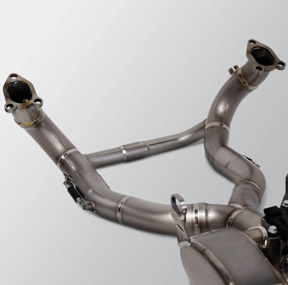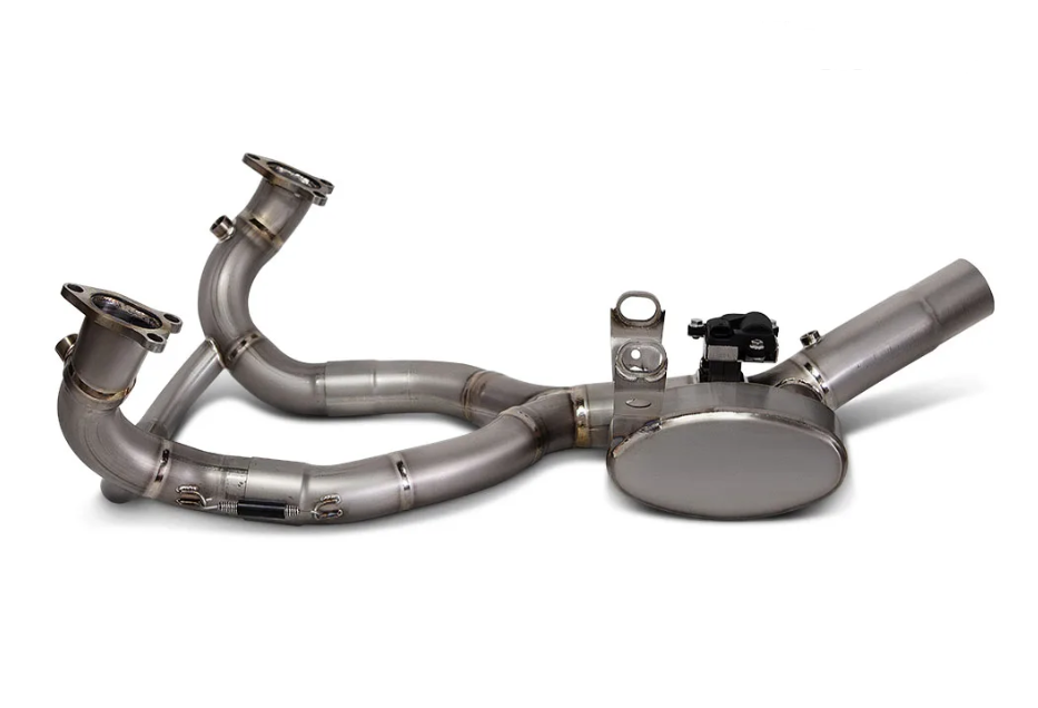 Manifolds made from high-quality titanium improve the motorcycle's performance and sound. They reduce weight by 5 kilos compared to the stock manifolds.