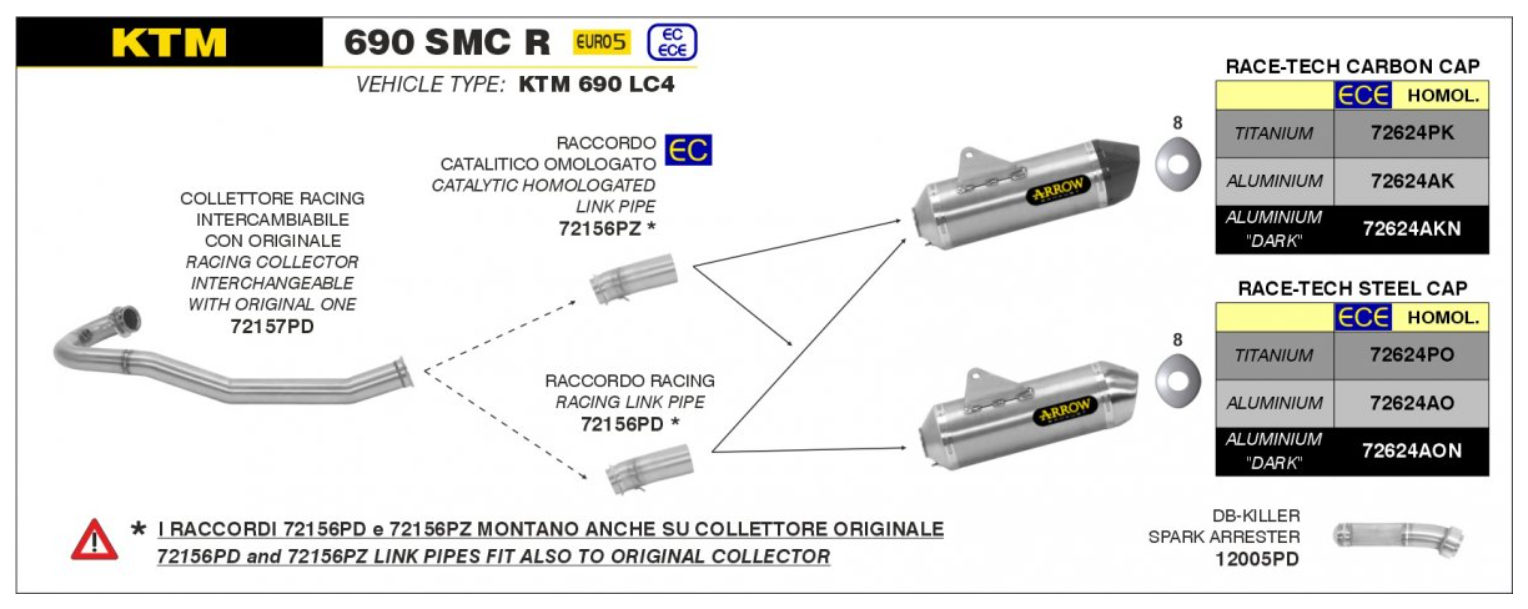 - KTM 690 SMC R 2019-2020 : The exhaust is homologated for EURO 5, EC ECE provided you purchase the homologated Arrow link pipes 72156PZ separately. It is mandatory to purchase the link pipe separately in order to be able to mount the exhaust on your bike: the homologated link pipe: 72156PZ. Otherwise, you would not be able to do so.