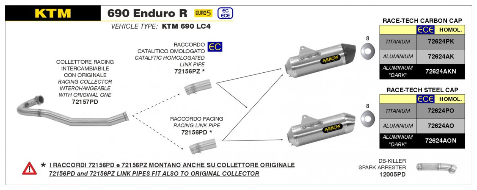 - KTM 690 Enduro R 2019-2020 : The exhaust is homologated for EURO 4, EC ECE provided you purchase the homologated Arrow link pipes 72156PZ separately. It is mandatory to purchase the link pipe separately in order to be able to mount the exhaust on your bike: the homologated link pipe: 72156PZ. Otherwise, you would not be able to do so.