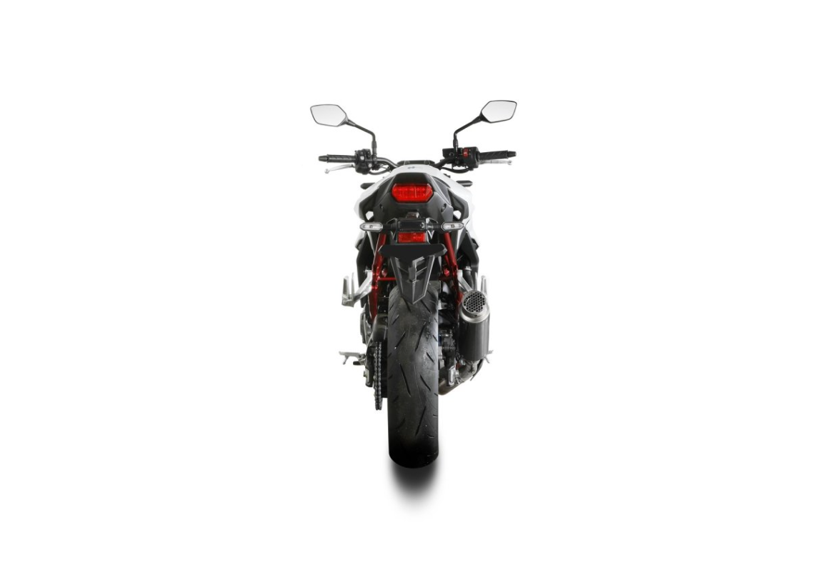 The exhaust line is made of carbon, which promotes faster heat dissipation, makes it lighter, and gives it a sportier look.