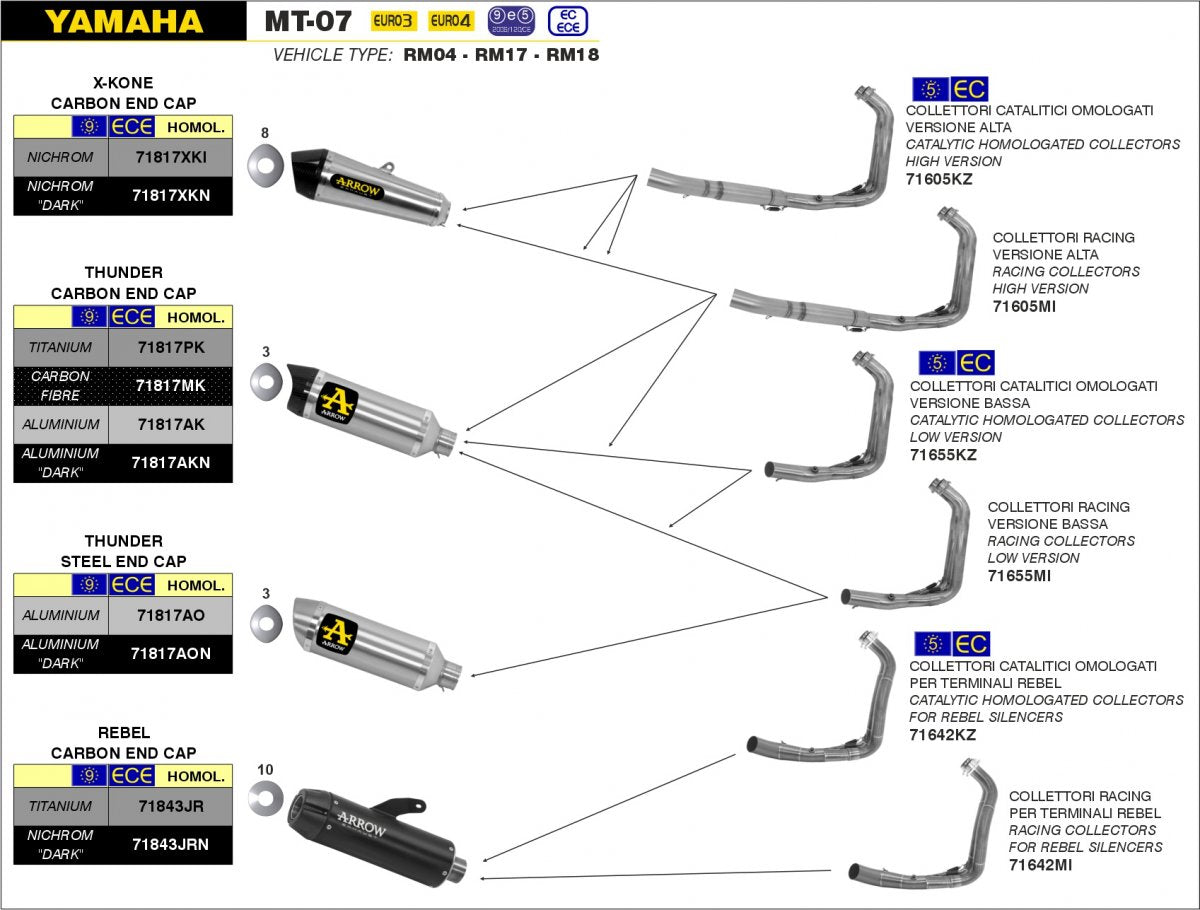 - Yamaha MT-07 2014-2020 : Estos colectores Arrow 71642MI nunca estarán homologados para emisiones de CO2