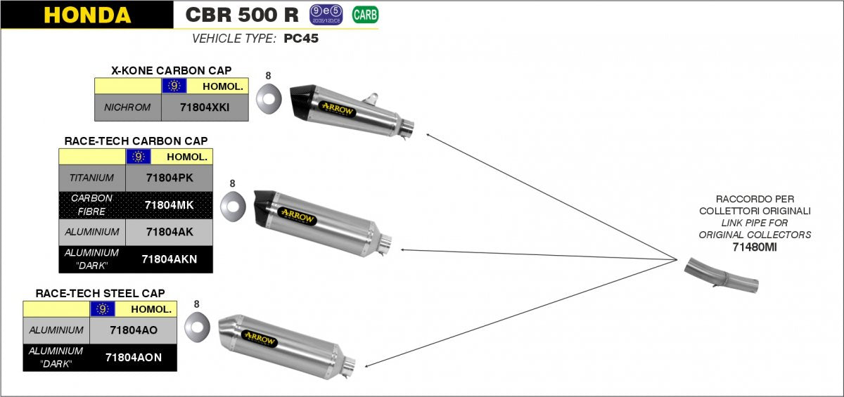 - Honda CBR 500 R 2016-2018 : El escape Arrow estaría homologado para EURO3, EURO4, EC ECE, CARB cuando se instale en los tubos de enlace originales. Sin embargo, si desea mejorar el rendimiento de su moto, puede optar por los tubos de enlace ARROW 71640MI, aunque en este caso, el escape Arrow 71804AON no estará homologado para emisiones de CO2, ya que no hay un catalizador en el tubo de enlace.