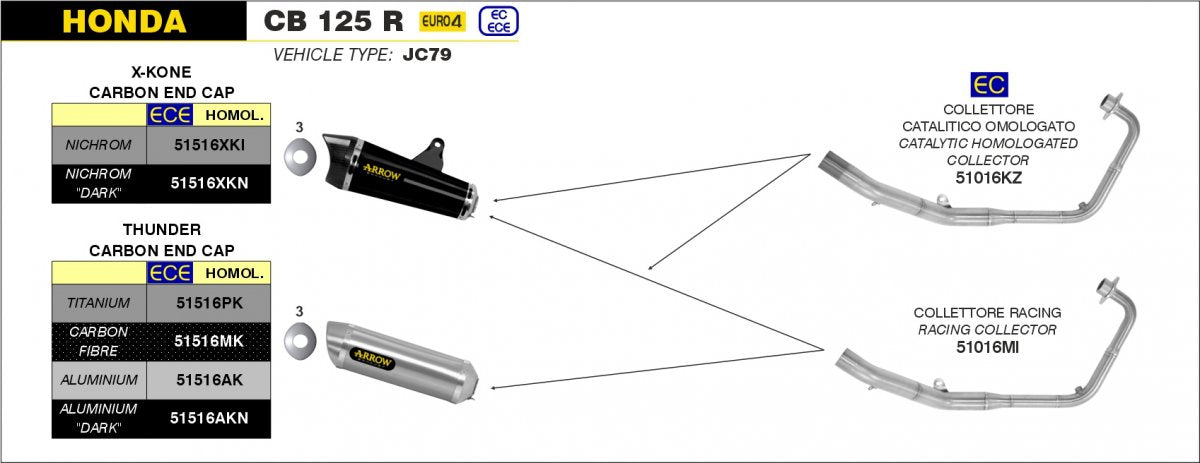 - Honda CB 125 R 2018-2020 : El escape Arrow 51516XKN ya está homologado para EURO4 EC ECE. Para montar el escape 51516XKN es obligatorio comprar por separado los colectores 51016KZ.