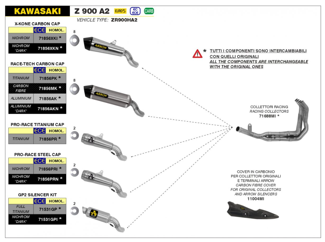 - Kawasaki Z 900 A2 2019-2020 : El escape Arrow estaría homologado para EURO 4, EC ECE, CARB cuando se instale en los colectores originales. Si utiliza los colectores ARROW, el escape no estará homologado para emisiones de CO2 ya que no hay un catalizador en su interior.