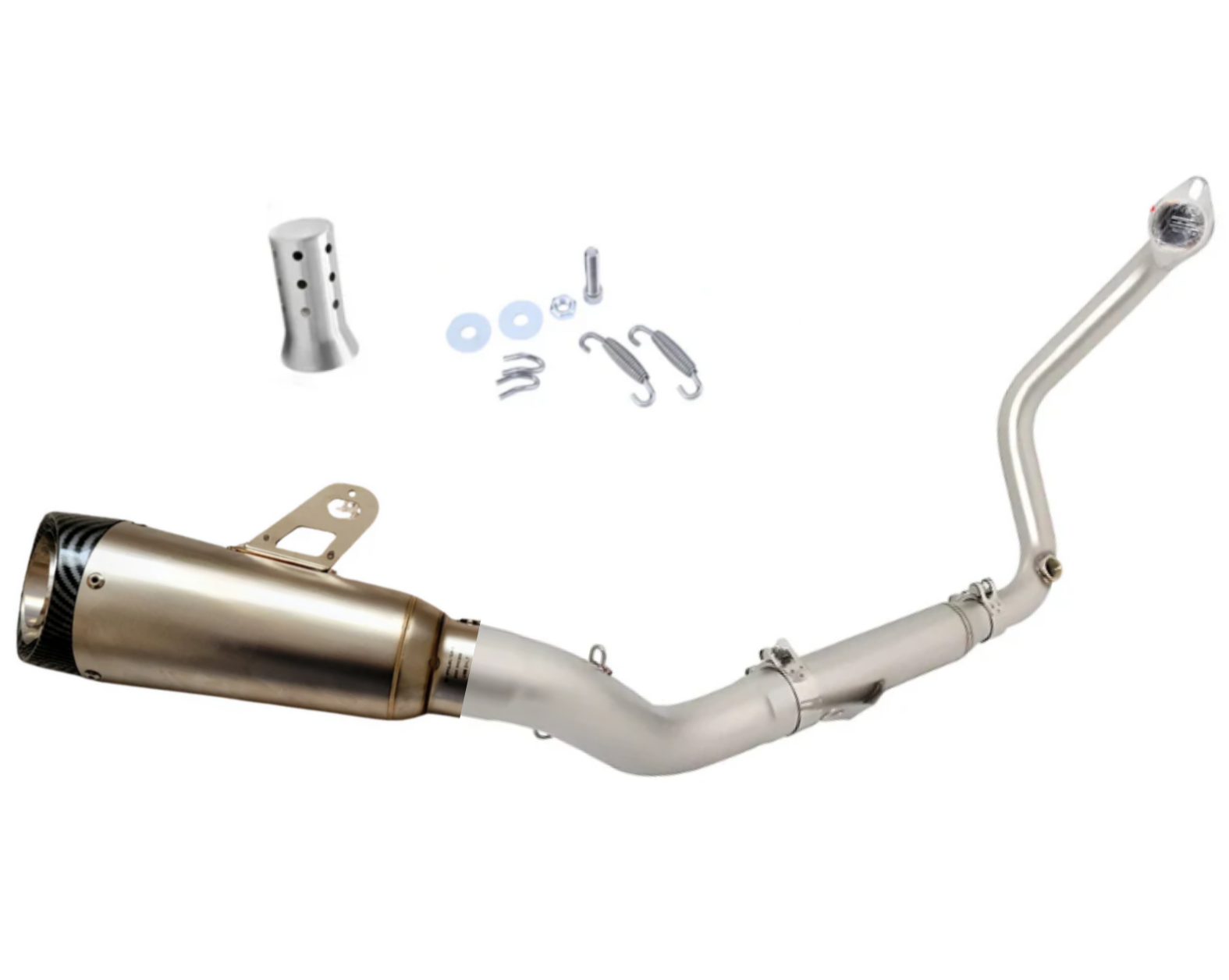 La Línea Completa incluye: Silenciador con Db-Killer extraíble, Colector específico para la moto desde el motor y Kit de montaje completo.