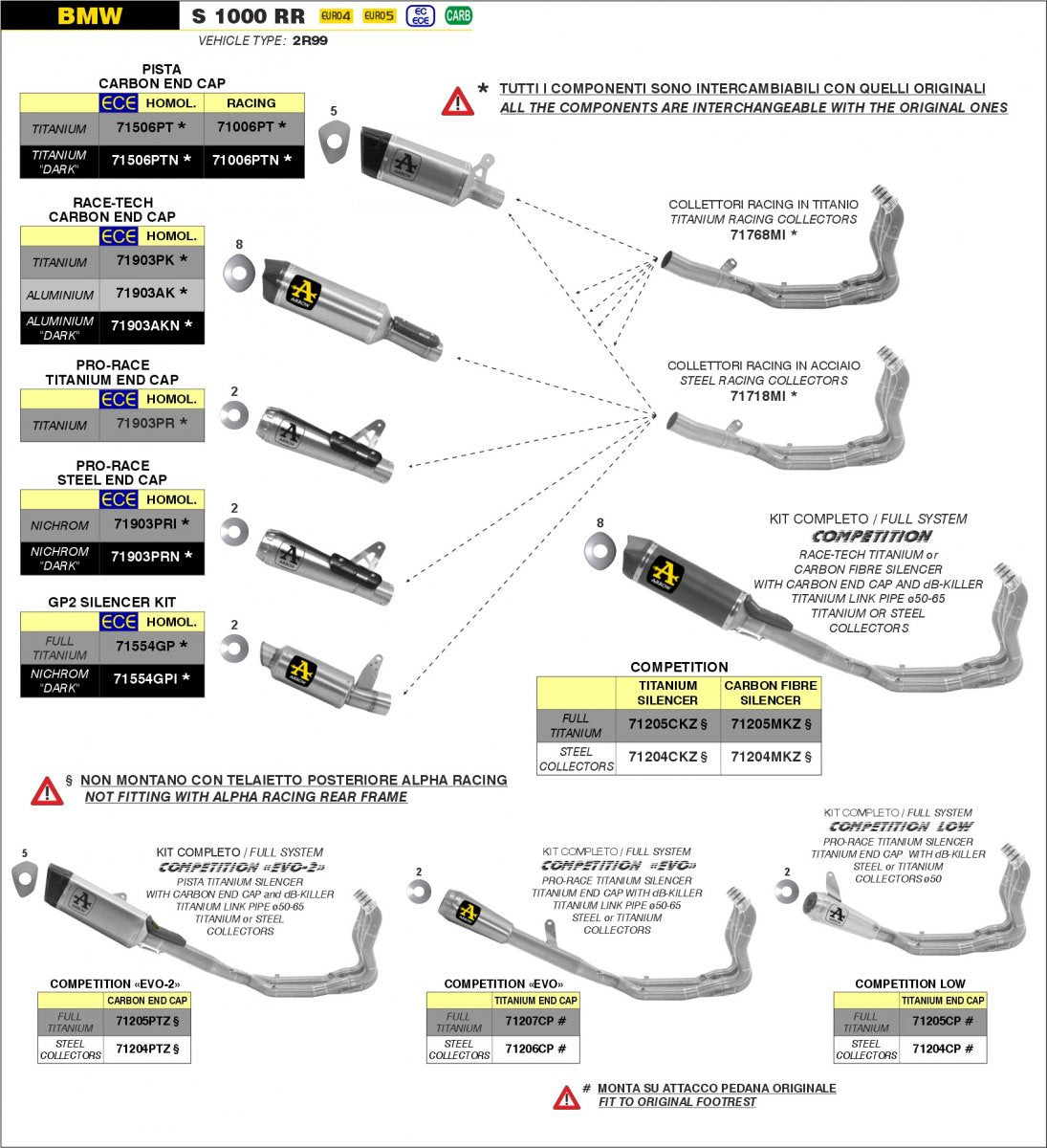 - BMW S 1000 RR 2019-2024: O escapamento Arrow seria homologado para EURO 4, EURO 5, EC/ECE e CARB quando instalado nos coletores originais. Se você usar os coletores ARROW, o escapamento não será homologado para emissões de CO2, pois não há conversor catalítico interno.