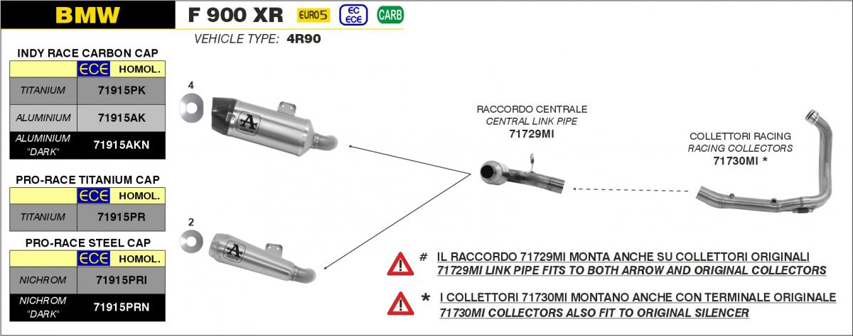 - BMW F 900 XR 2020-2024: O escapamento Arrow seria homologado para EURO5, EC ECE, CARB quando instalado nos tubos de ligação originais. No entanto, se você quiser melhorar o desempenho da sua moto, pode optar pelos tubos de ligação ARROW 71729MI, embora, neste caso, o escapamento Arrow 71915PR não seja homologado para emissões de CO2, já que não há catalisador no tubo de ligação.